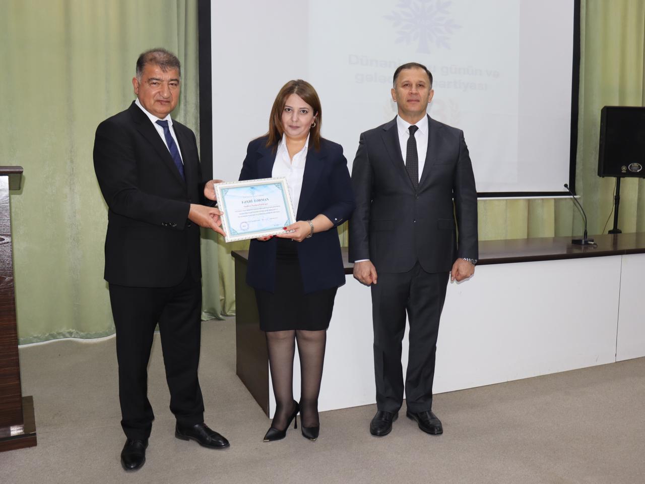 Çıxışlardan sonra Yeni Azərbaycan Partiyasının yaradılmasının 33-cü ildönümü münasibətilə və Partiyada ictimai-siyasi fəaliyyətinə görə bir qrup partiya fəalına fəxri fərmanlar, partiyaya yeni üzv qəbul edilmiş şəxslərə isə üzvlük vəsiqələri təqdim edilib.